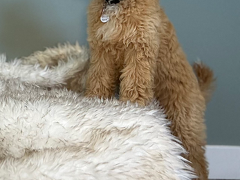 Taylor, born on January 9, 2024, is our newest addition but already boasts extensive on-set experience. Well-trained for print and media, Taylor works seamlessly with both adult and child actors and is well-socialized with other animals. Energetic, sweet, and always ready to work, Taylor's apricot and white coat and 25-pound frame make her a standout. She stands 18 inches to the shoulder and measures 19 inches from neck to tail, with a neck circumference of 13 ½ inches. Taylor's impressive portfolio includes work for brands like Target and Tommy Hilfiger.